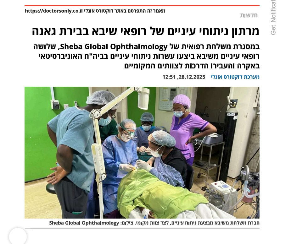 רפואה ללא גבולות: משלחת רופאים משיבא ביצעה מרתון של עשרות ניתוחי עיניים בגאנה שבאפריקה. בכתבה באתר Doctors Only, מתייחס פרופ' עידו דידי פביאן, מנהל Sheba Global Ophthalmology, להצלחת המשלחת ולתוכניות להעמקת שיתוף הפעולה, הכוללות הכשרת צוותים מקומיים ופיתוח פרוטוקולים קליניים.